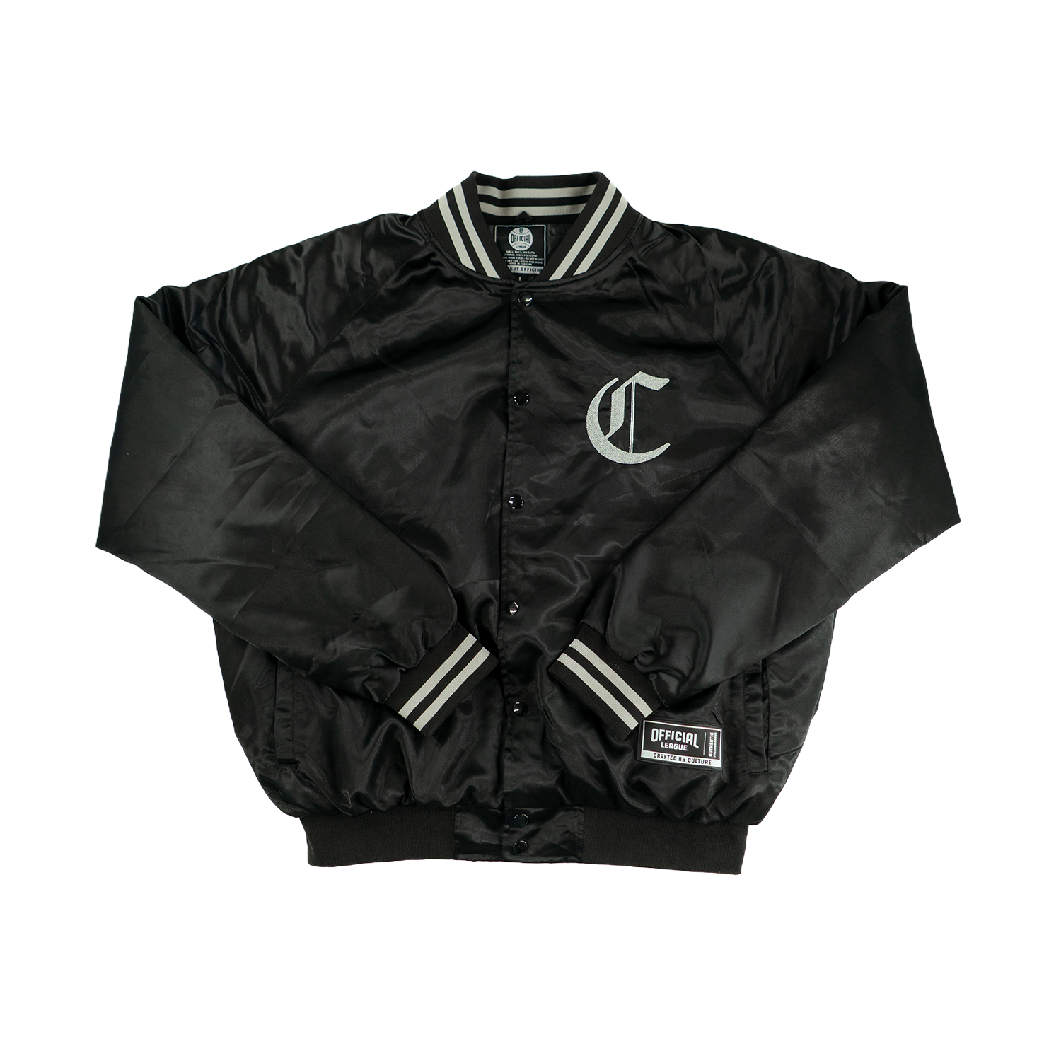 Black Chroma-themed jacket with a premium satin finish featuring silver embroidery "C" on the front pocket position and back, snap buttons, ribbed cuffs and collars, and a comfortable interior lining.