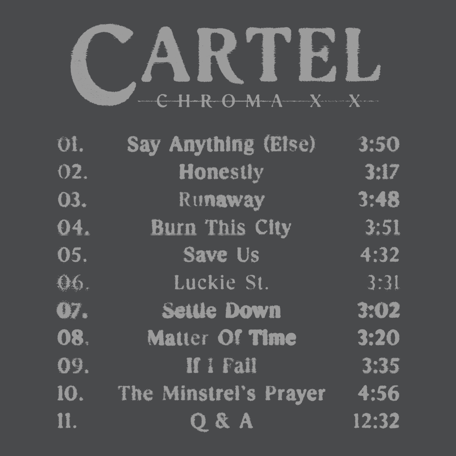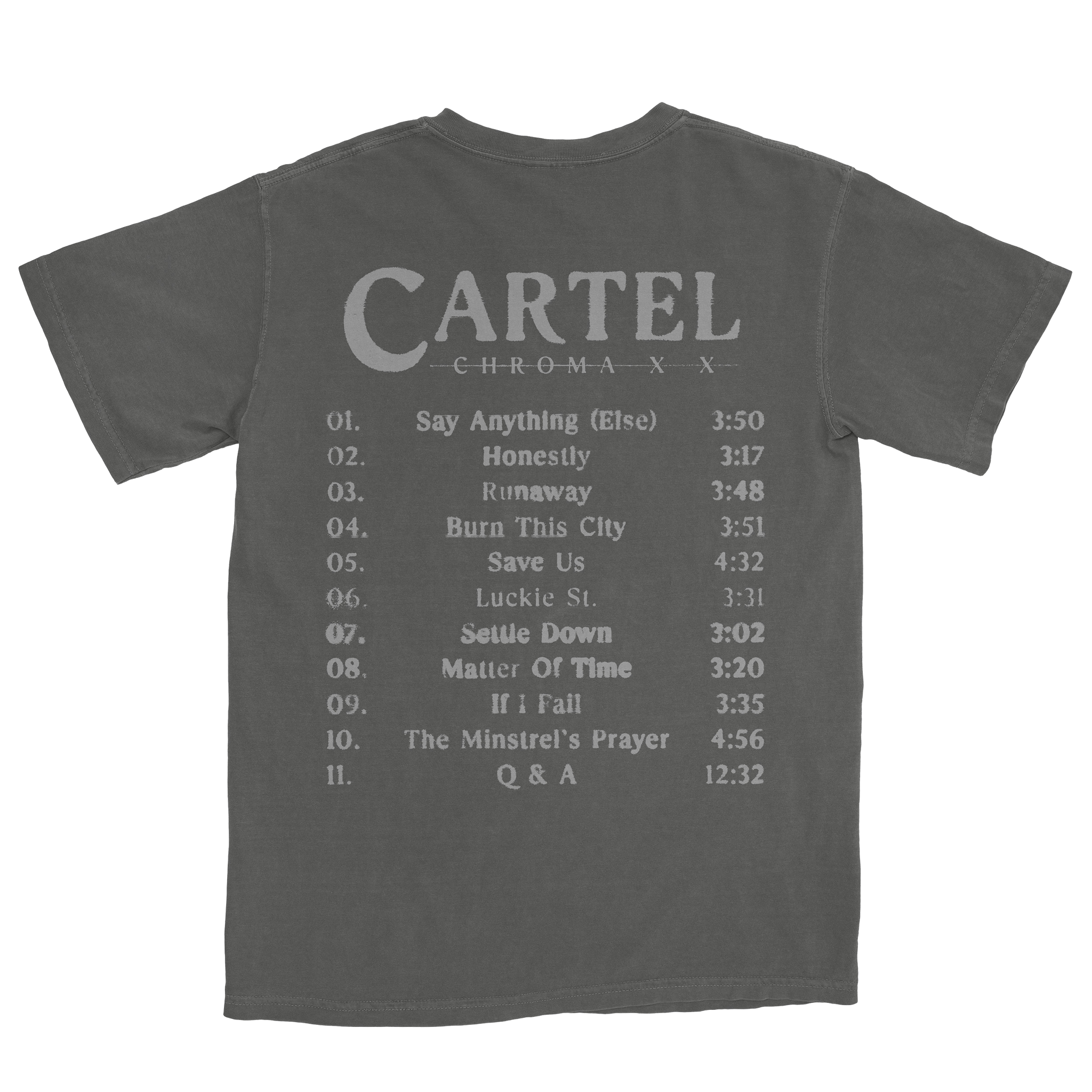 As seen on Cartel's Chroma 20 Year Anniversary Tour. This fun track list tee!